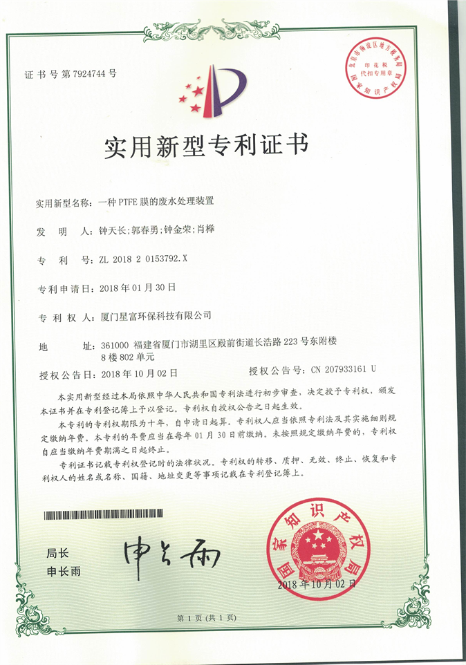 我司關(guān)于一體化PTFE-MBR系統(tǒng)污水處理設(shè)備已經(jīng)申請(qǐng)相關(guān)專(zhuān)利,并取得證書(shū):一種PTFE膜的廢水處理裝置,專(zhuān)利號(hào)為ZL 2018 2 0153792.X